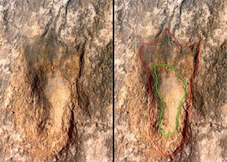 Megkövült emberi lábnyom(zölddel jelölve), mely a sárban követett egy dinoszauruszt(piros). (minimum 65 millió éves) |